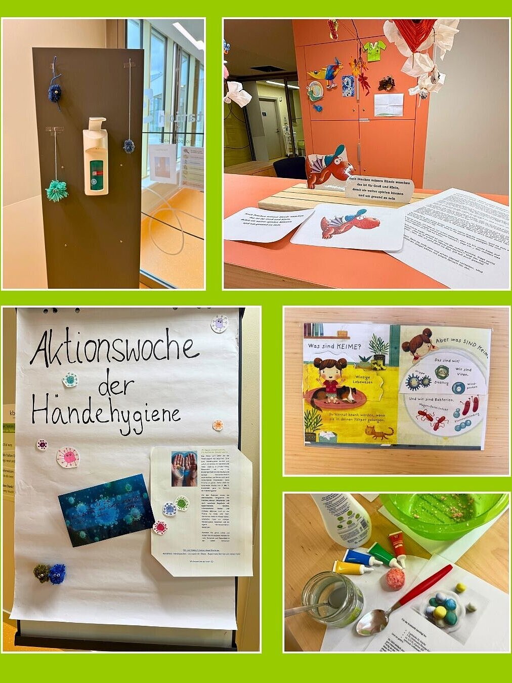 November 2025 - Das Wetter wird kälter und die Erkältungszeit hat begonnen. Eine gute Händehygiene schützt uns selbst und andere vor Bakterien und Viren. Besonders bei uns im kbo-Kinderzentrum ist eine häufige und richtige Händedesinfektion unverzichtbar, um Keimen und damit verbundenen Krankheiten keine Chance zu geben.Daher stand die Woche vom 3. bis 7. November ganz im Zeichen der Händehygiene!Sowohl auf den Stationen als auch im Eingangsbereich wartete ein interessantes Programm mit Experimenten, Spielen, Infomaterialien, Bastel- und Vorleseaktionen rund um das Thema für Groß und Klein.Unter anderem wurde Knetseife selber gebastelt, Geschichten zum Händewaschen vorgelesen, in verschiedenen Experimenten gezeigt, wie Händedesinfizieren und Händewaschen gegen Keime hilft und ein UV-Selbsttest angeboten, um zu sehen wie gründlich man die eigenen Hände desinfiziert. Ein herzliches Dankeschön an alle, die diese Aktionswoche ermöglicht haben.